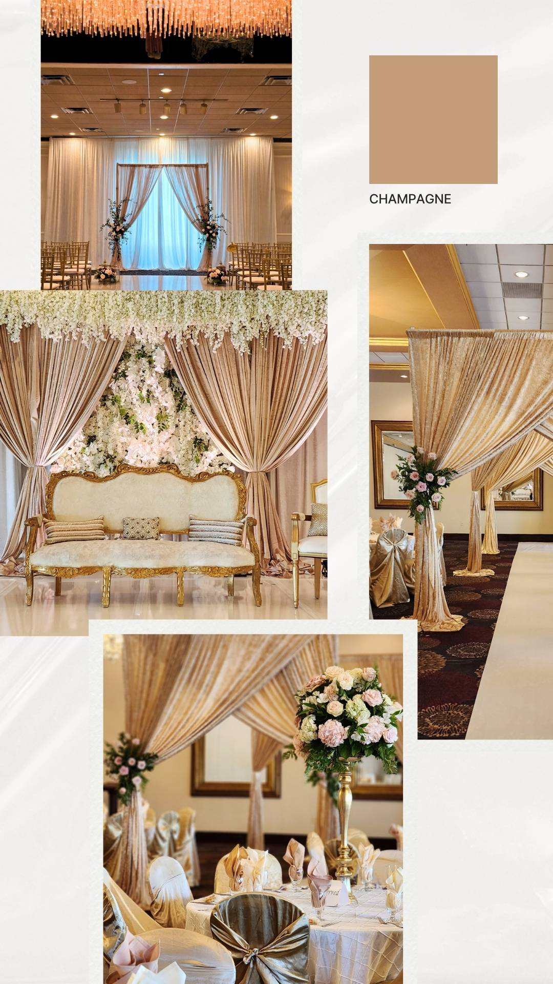 What I love about champagne and gold is the way it interacts with light. Candlelight, uplighting, chandeliers – this palette catches every source of warmth in a room and amplifies it. By the time your guests sit down for dinner, the whole room feels like it’s glowing.