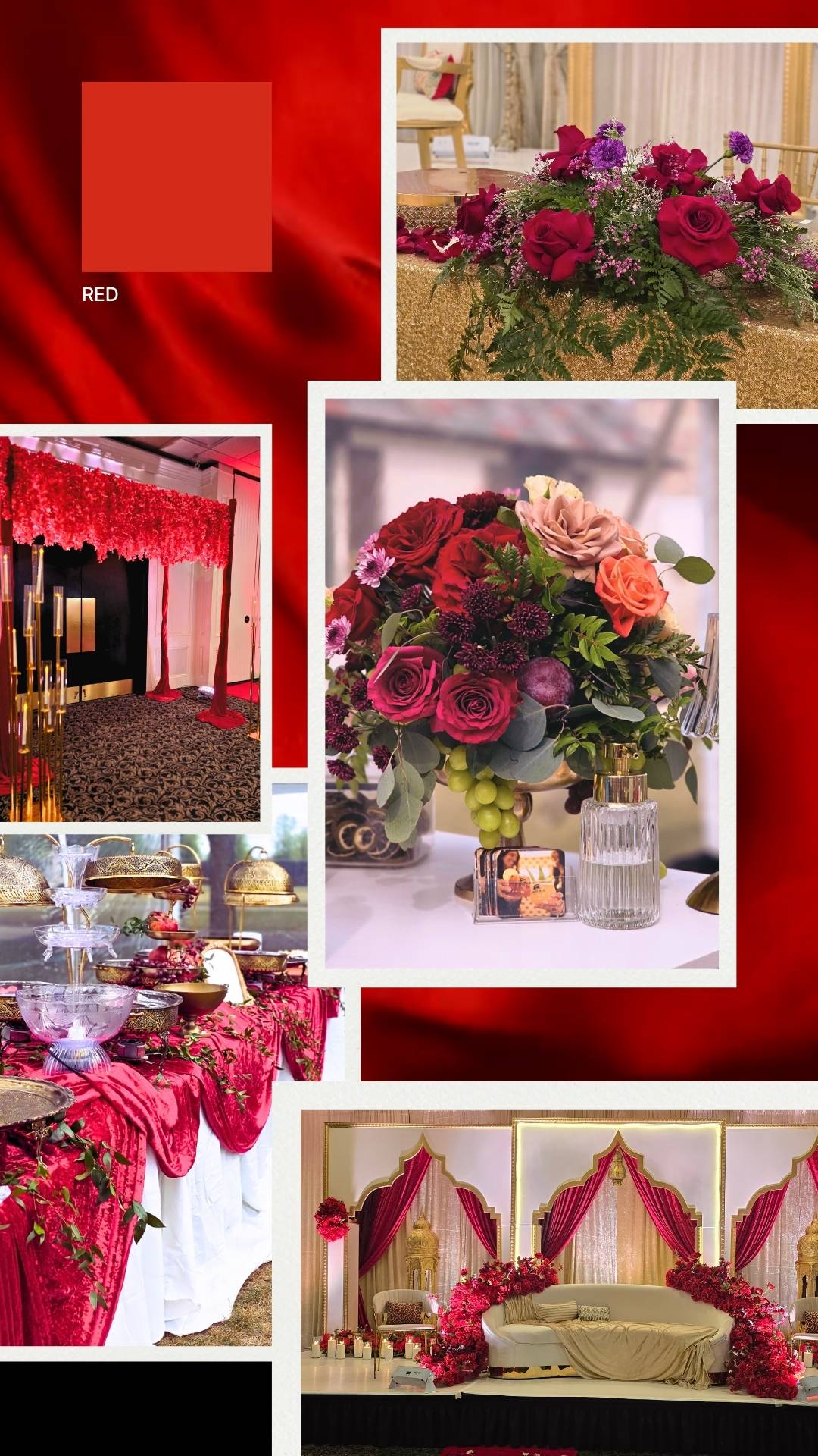 Deep red and burgundy,the boldest wedding color trend in Metro Detroit for 2026. From dramatic floral centerpieces to rich velvet draping and statement stage designs, this palette is for couples who aren’t afraid to make an entrance.