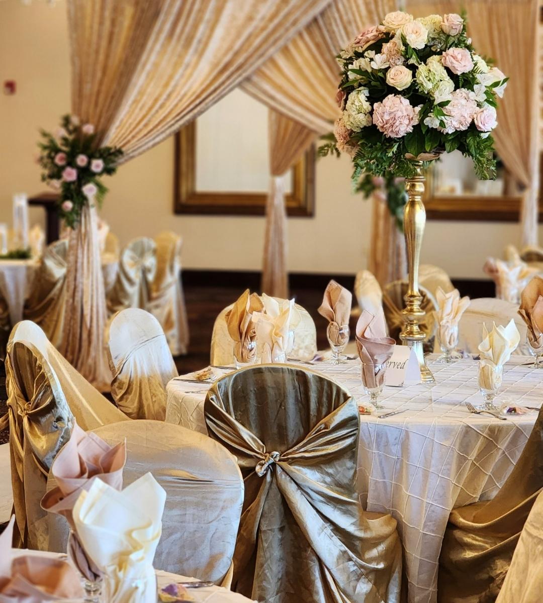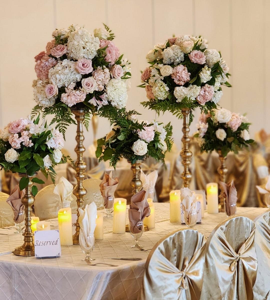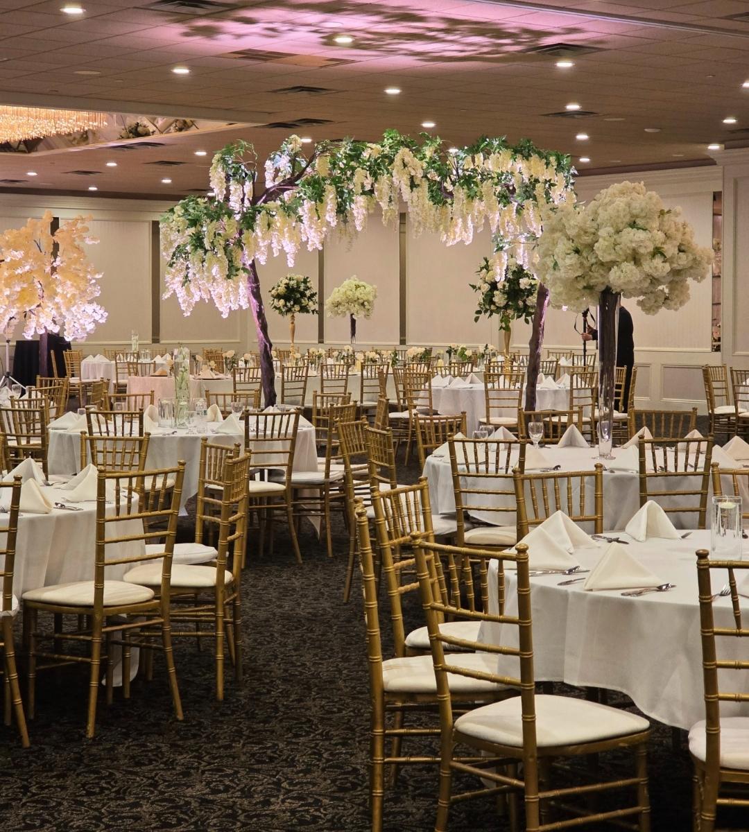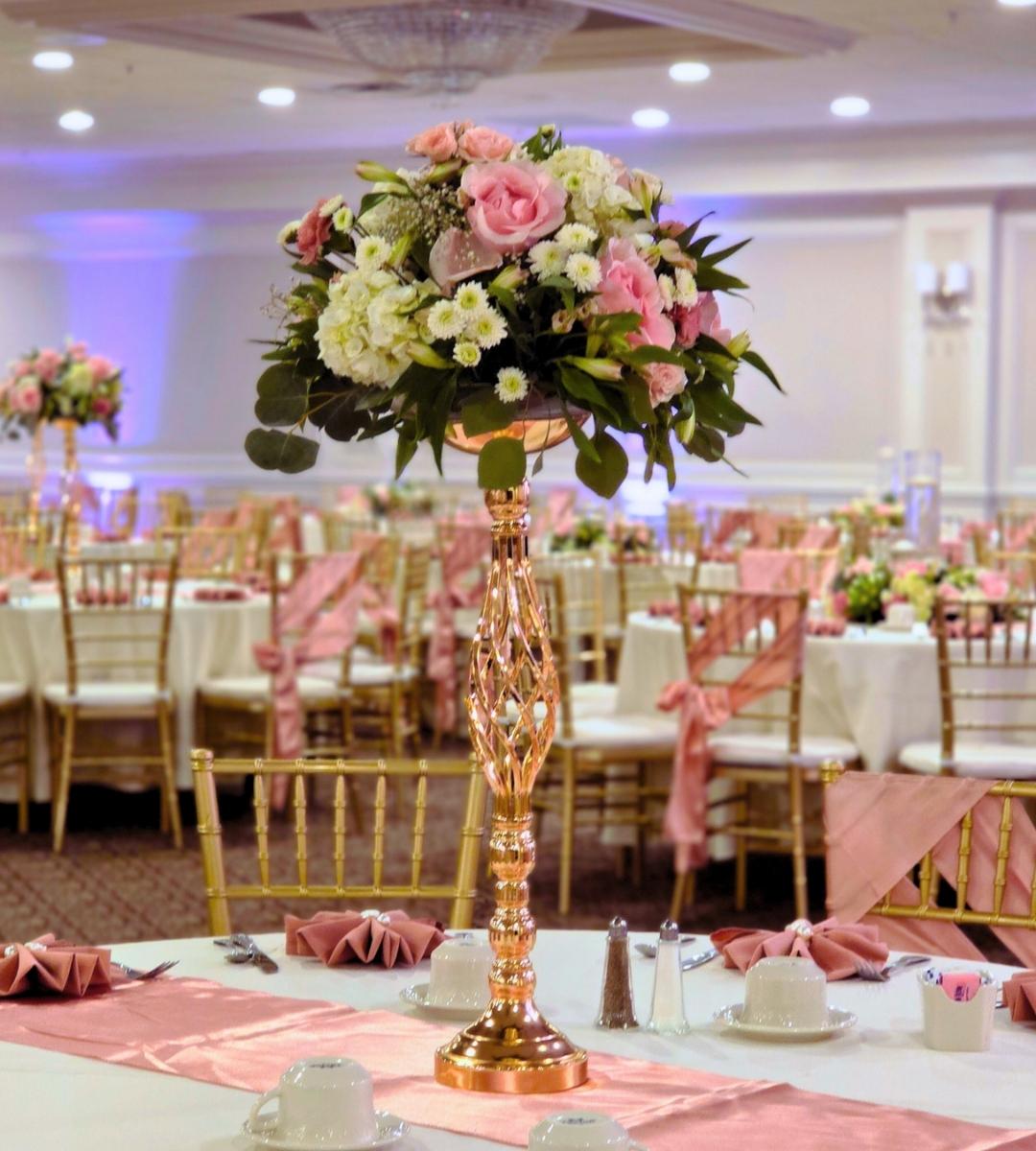 A: Champagne and gold, midnight blue and silver, and deep red and burgundy are the three palettes that perform best in grand ballroom settings. They take advantage of high ceilings, dramatic lighting, and large-scale design elements. Our premium centerpiece collection and party rentals are designed with exactly these palettes in mind. Contact us to discuss your venue.