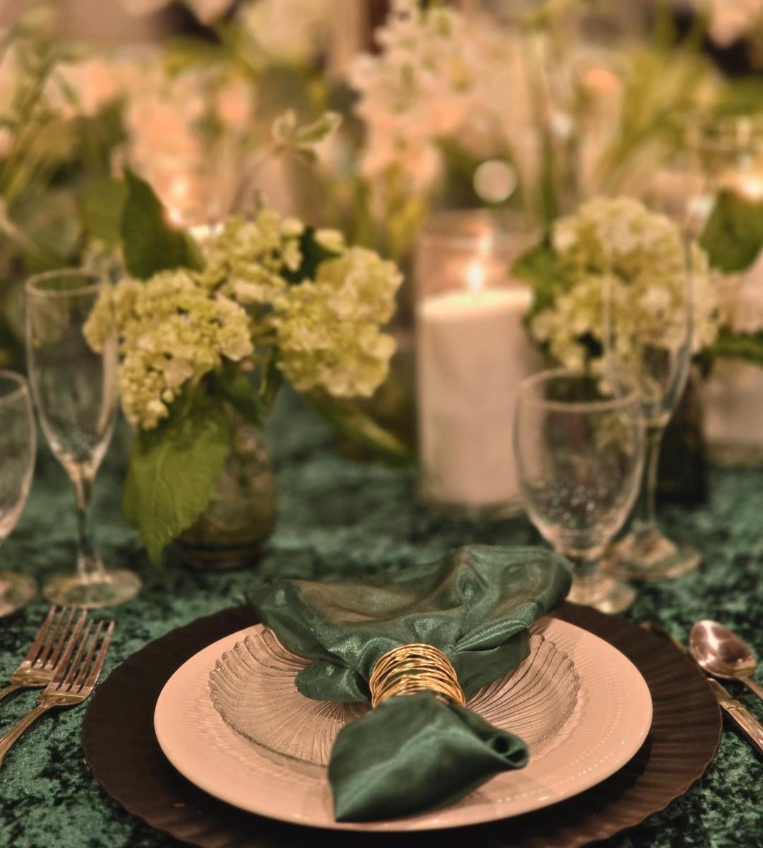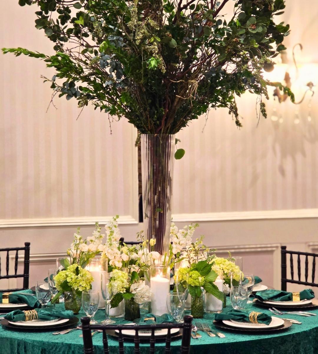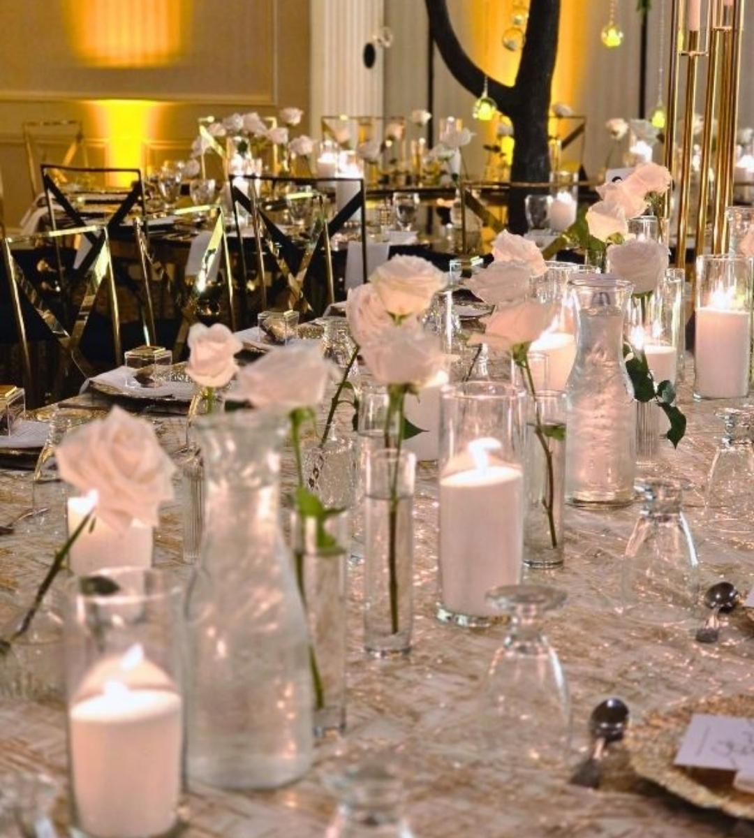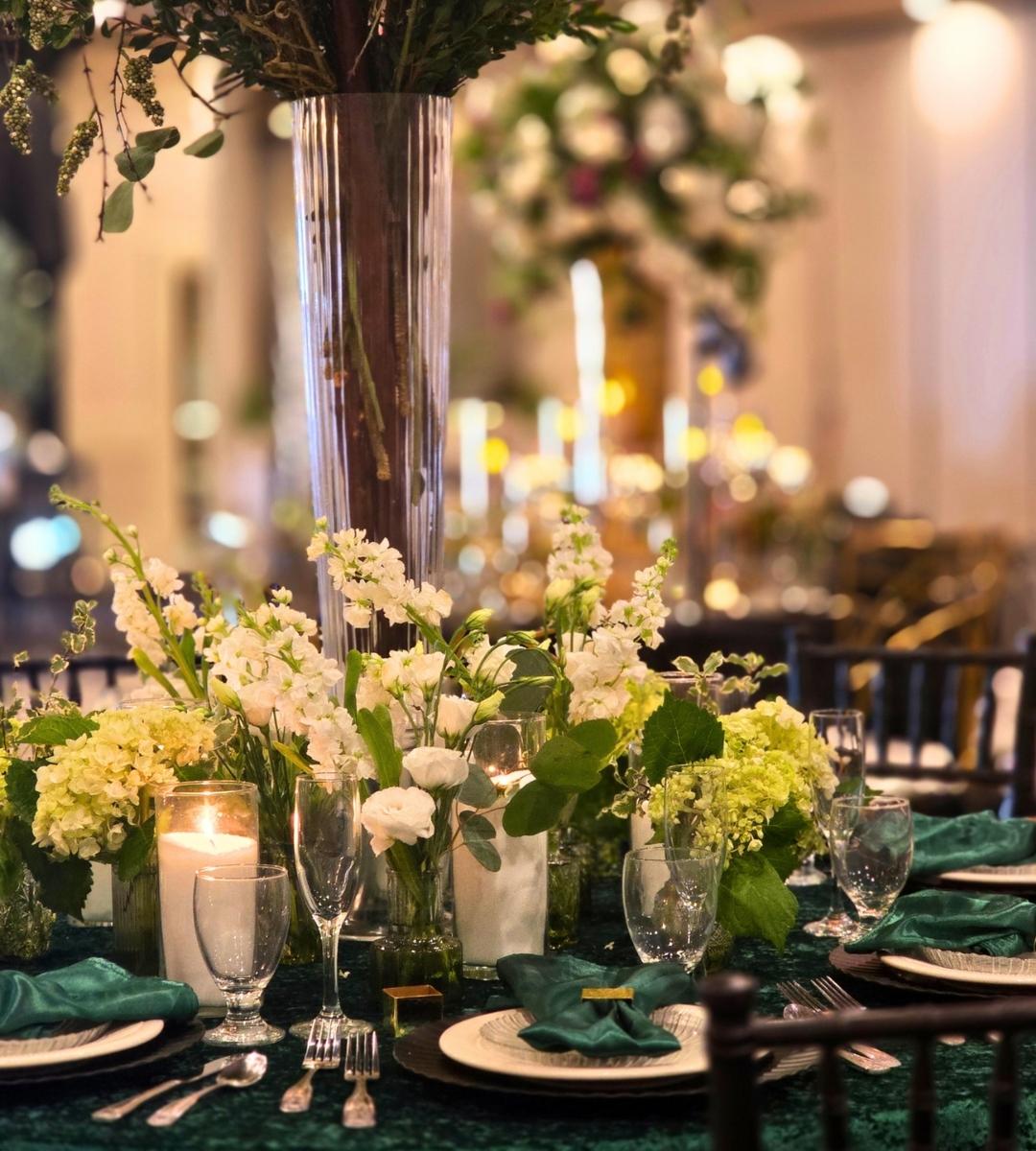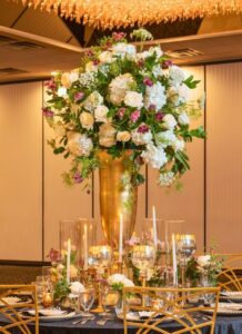 A: Champagne and gold, midnight blue and silver, and deep red and burgundy are the three palettes that perform best in grand ballroom settings. They take advantage of high ceilings, dramatic lighting, and large-scale design elements. Our premium centerpiece collection and party rentals are designed with exactly these palettes in mind. Contact us to discuss your venue.