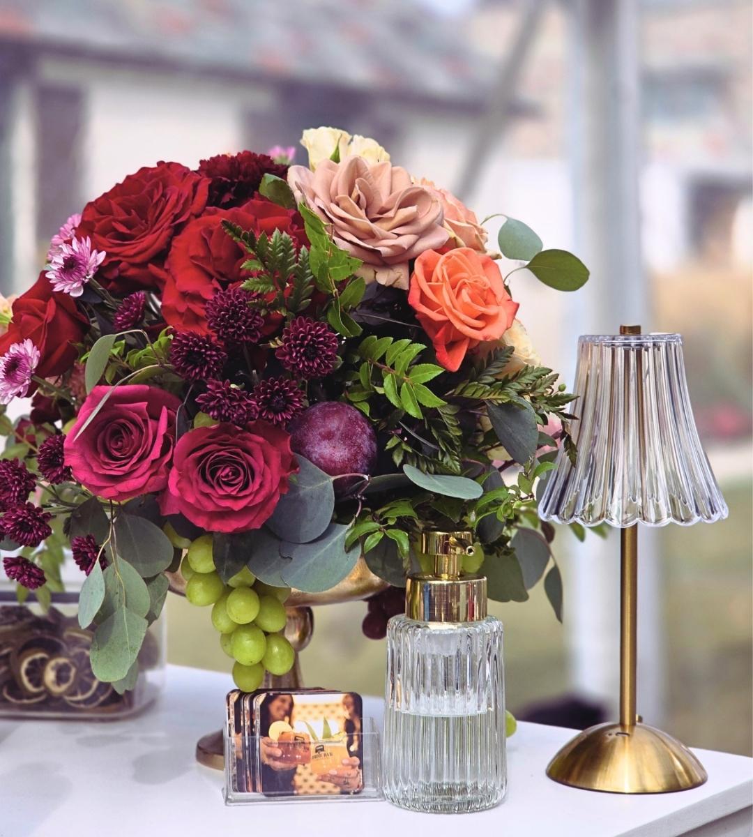 How we use it at Bridal Insignia: Deep red works best when it’s used with intention rather than saturation. A backdrop of deep burgundy velvet draping with cascading red floral installations creates a dramatic focal point without overwhelming the room. For bridal party florals, deep red roses and burgundy dahlias in the bridal bouquet photograph stunningly against almost any dress. We also love pairing deep red centerpieces with candlelight on standard collection tables – the warmth of the flame against the richness of the bloom creates something truly breathtaking.